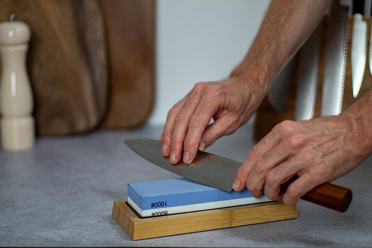 To make sharpening on a whetstone easier, we recommend using with the Season Knife Sharpening Guide.