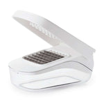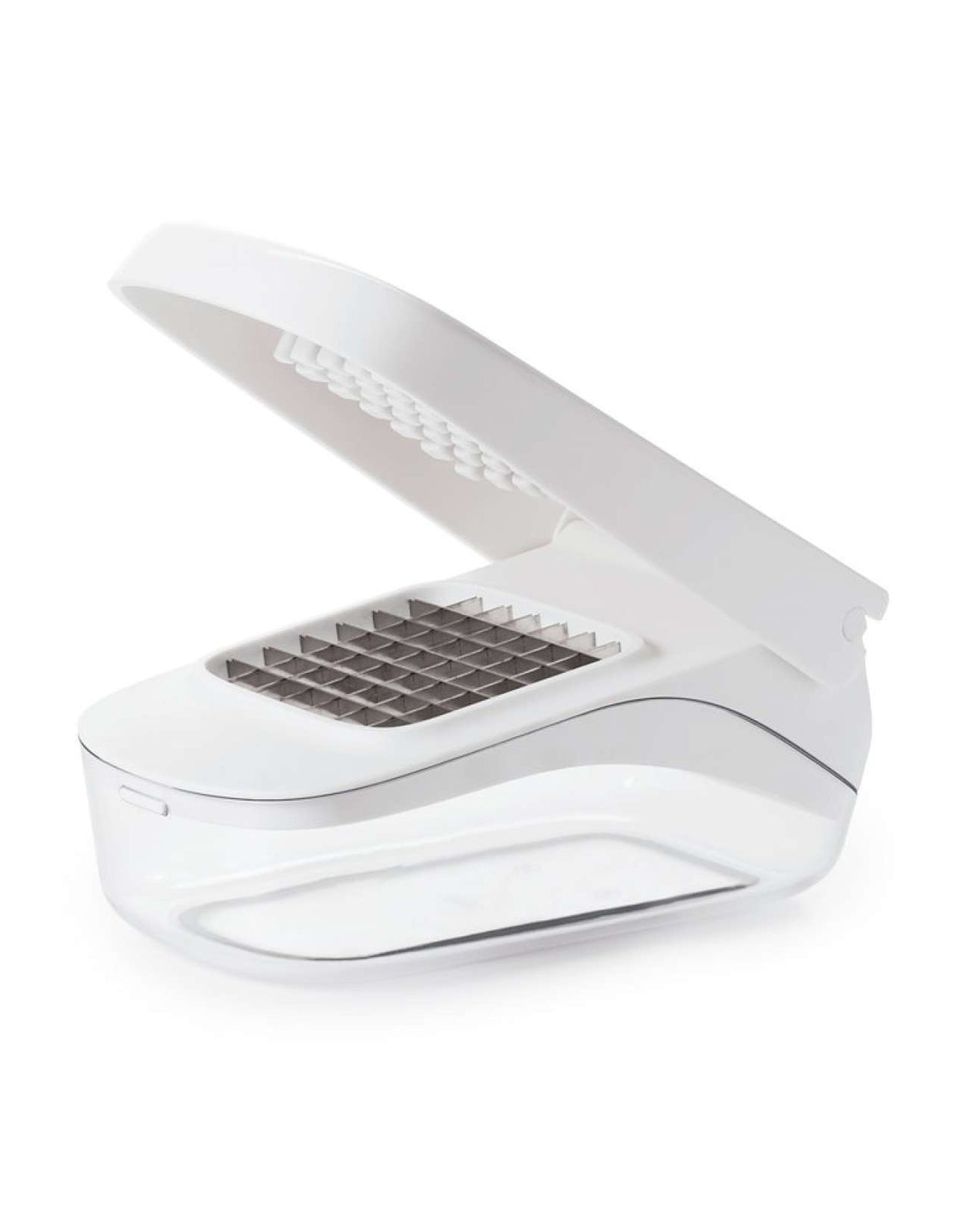 Quickly and safely chop onions, peppers, and more in one easy motion, and easily pour chopped fruits or veggies without removing the lid. The stainless steel blade pattern and recessed cutting area keeps food in place while the lid provides leverage for efficient chopping.